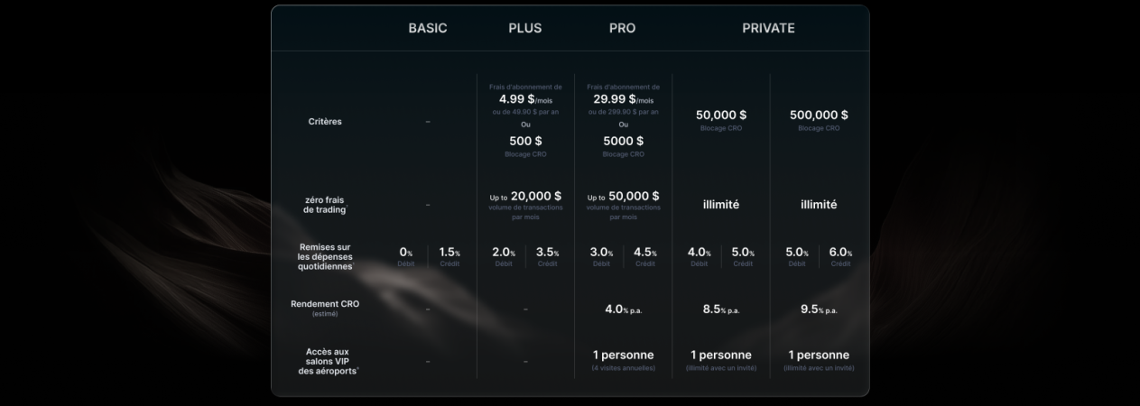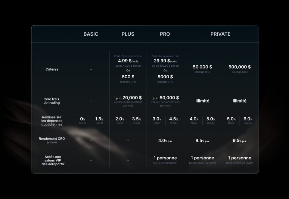 1 Offre réservée aux membres Level Up Rewards des niveaux Pro et Private. Cliquez ici pour consulter les Conditions générales. L’accès Priority Pass™ est disponible pour les titulaires de carte Crypto.com éligibles des niveaux Pro et Private, sur inscription avec un code d’invitation unique (UIC) fourni via l’application Crypto.com. L’inscription nécessite l’utilisation d’une carte de crédit Visa Signature® Crypto.com. L’accès aux salons est accordé via l’application mobile Priority Pass. Pour plus de détails, cliquez ici.